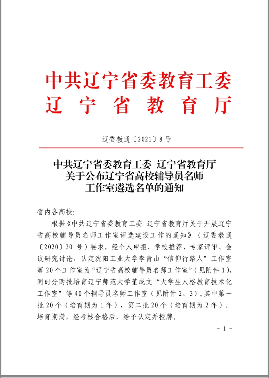 近日,在中共辽宁省委教育工委、辽宁省教育厅组织开展的辽宁省高校辅导员名师工作室评选活动中,我校“立名和他的朋友们”工作室被列为辽宁省辅导员名师工作室第一批培育对象,工作室主持人为运动训练学院辅导员孙立名,培育期为1年。培育期满经考核合格后,给予认定并授牌。