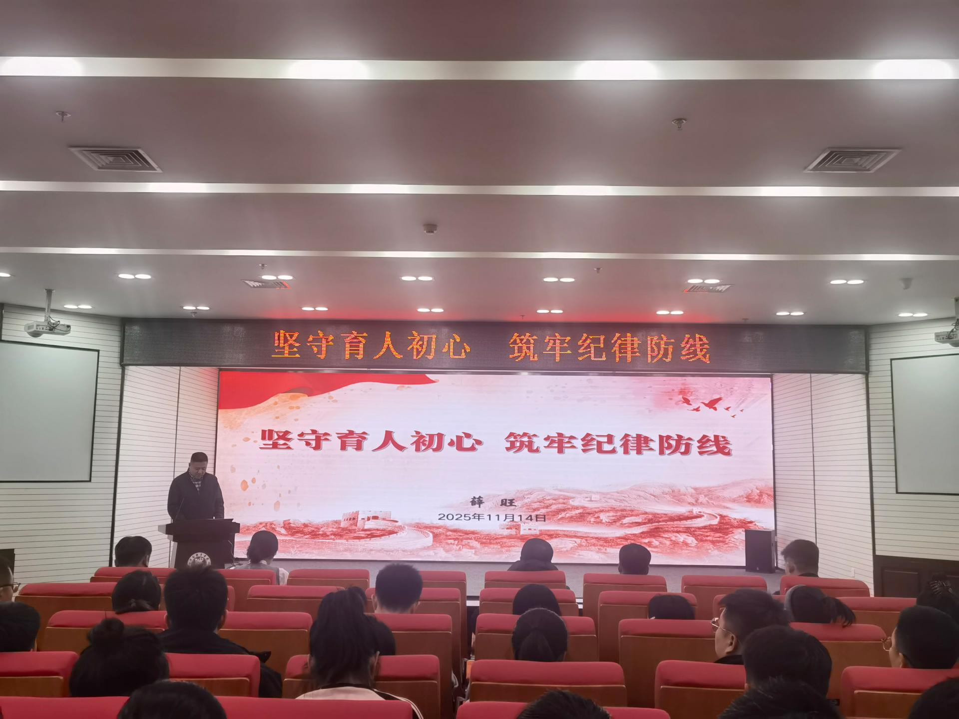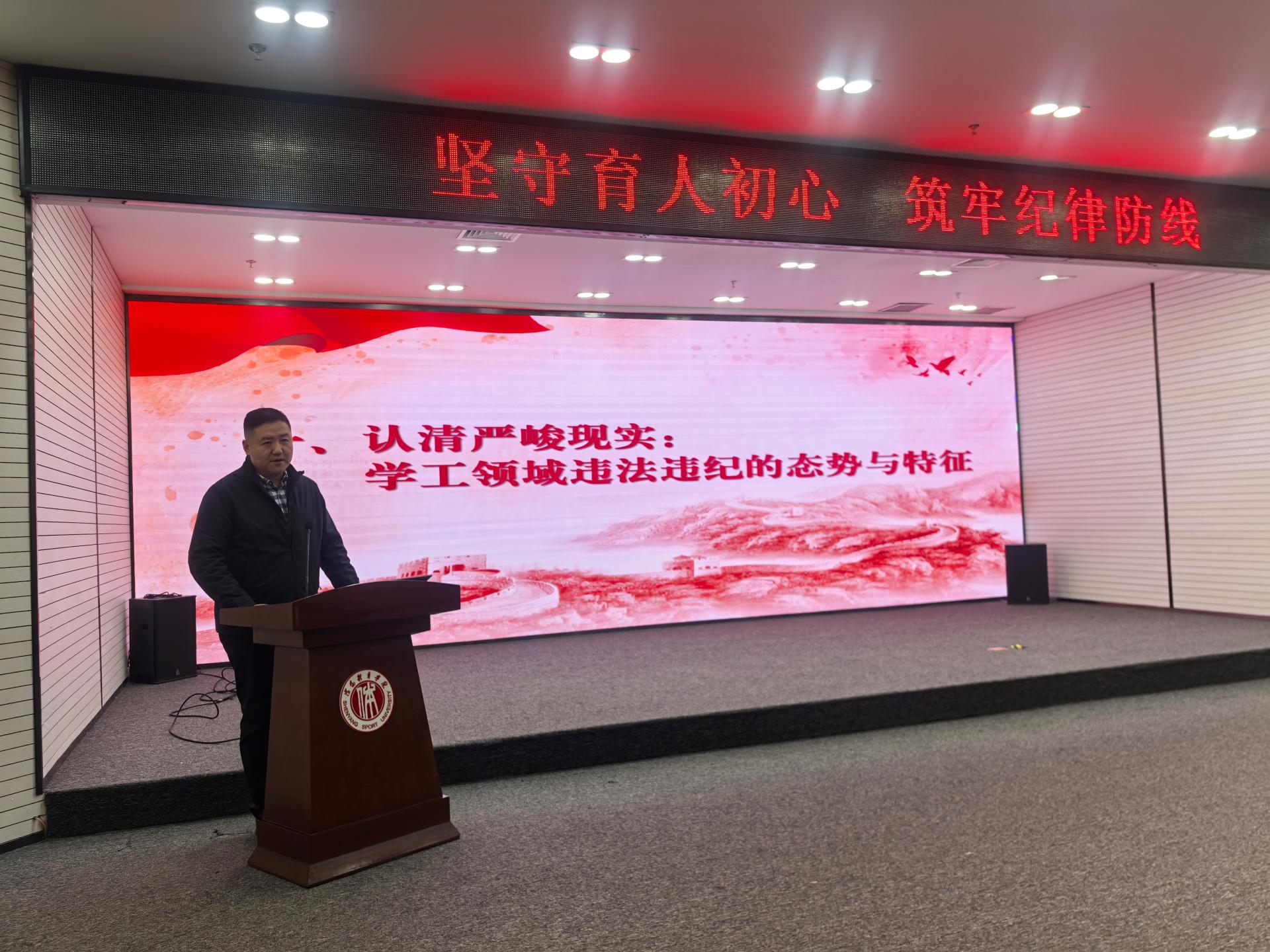 为全面加强辅导员队伍建设,筑牢纪律防线与廉洁意识,11月14日,沈阳体育学院党委学生工作部(学生处、武装部)组织全体学工干部70余人在图书馆二楼报告厅开展“坚守育人初心 筑牢纪律防线”专题警示教育学习。活动邀请学校纪委综合监察室副主任薛旺主讲,学生工作部副部长白绍闯主持。