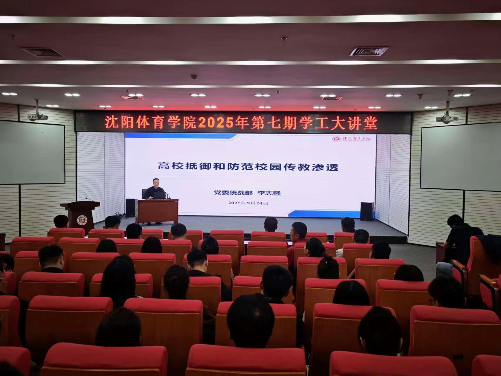 9月24日,党委学生工作部(学生处、武装部)组织开展2025年第七期“学工大讲堂”。本次大讲堂邀请到学校党委常委 党委统战部部长李志强作题为“高校抵御和防范校园传教渗透”的专题辅导报告。全体学工干部参加本次活动,活动由党委学生工作部(学生处、武装部)学生管理科科长侯天鹏主持。